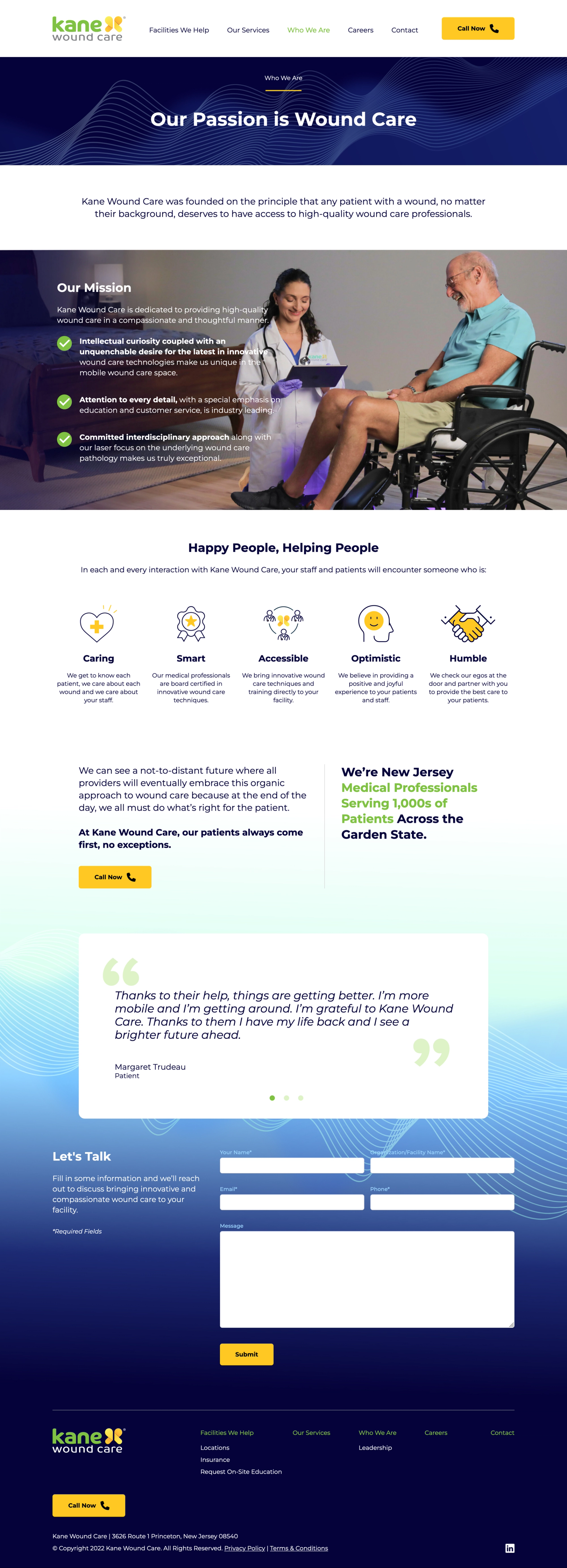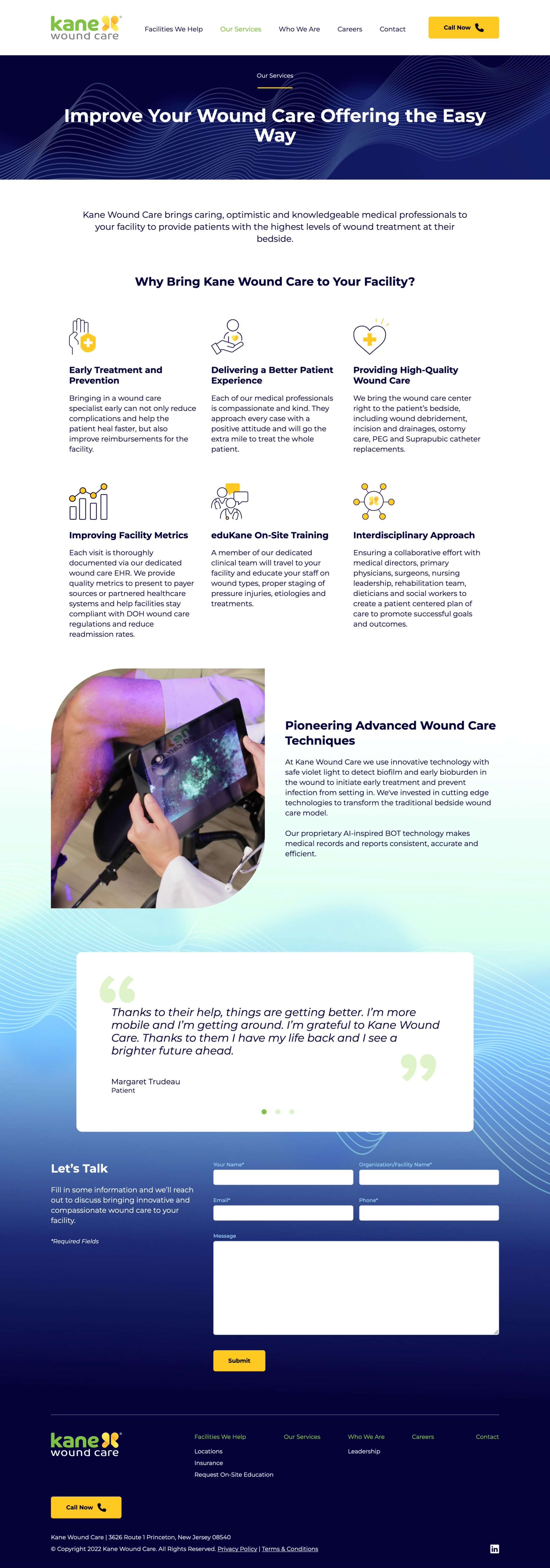 I developed this website while employed at Ridge Marketing. Kane Wound Care eliminates the hardship of traveling for wound treatments by providing wound care professionals along with high-level treatment to patients in any healthcare facility.