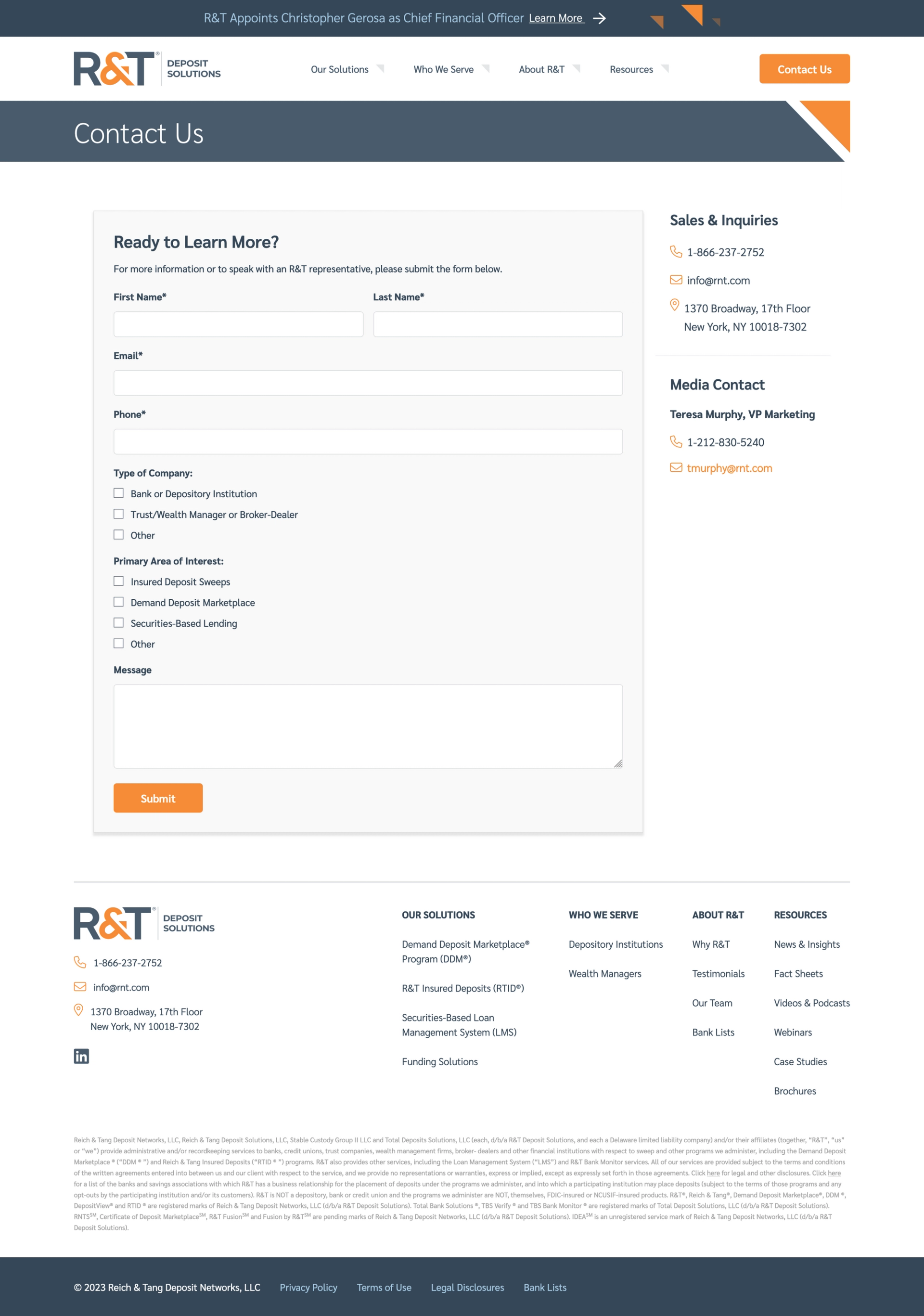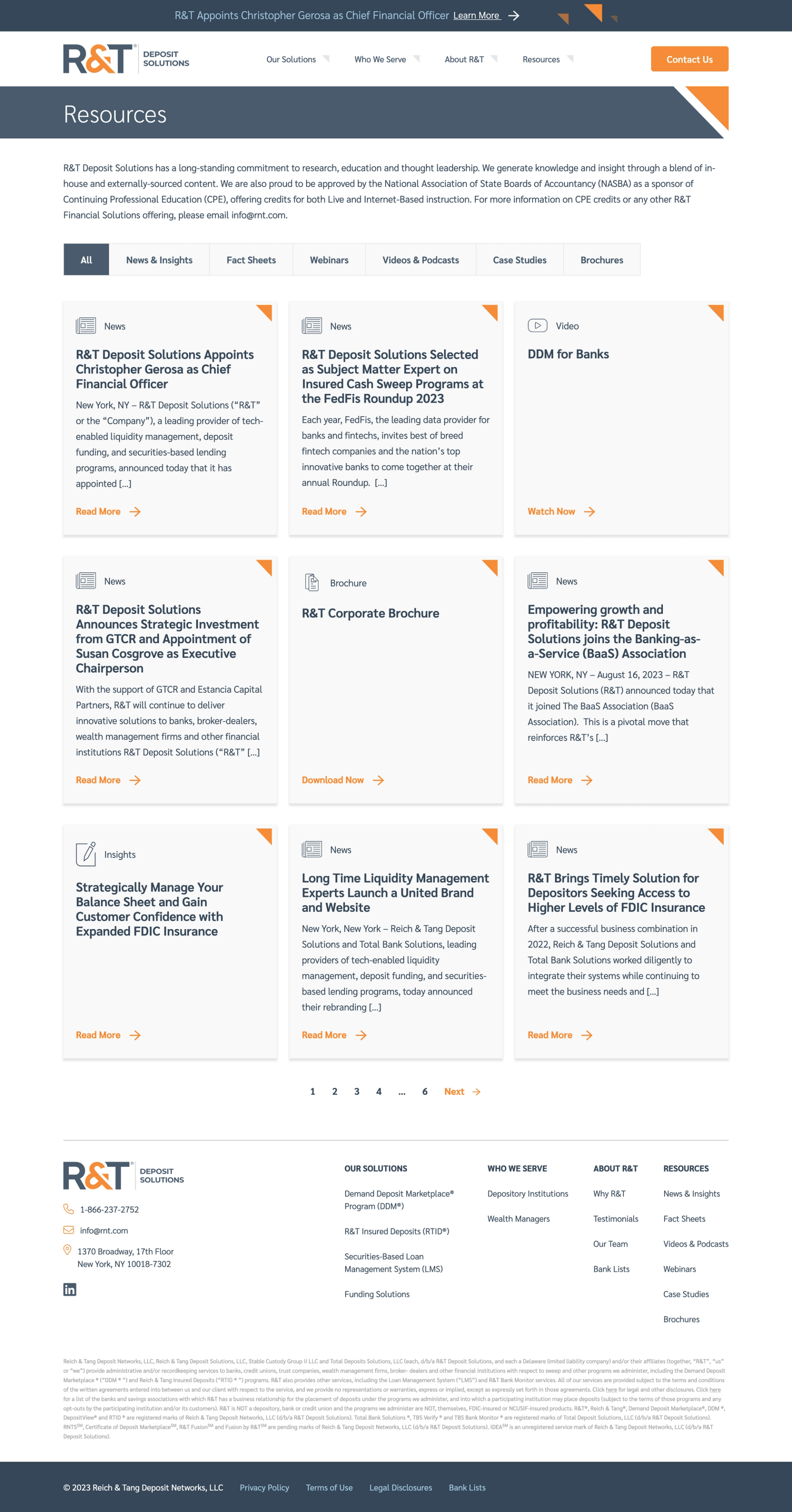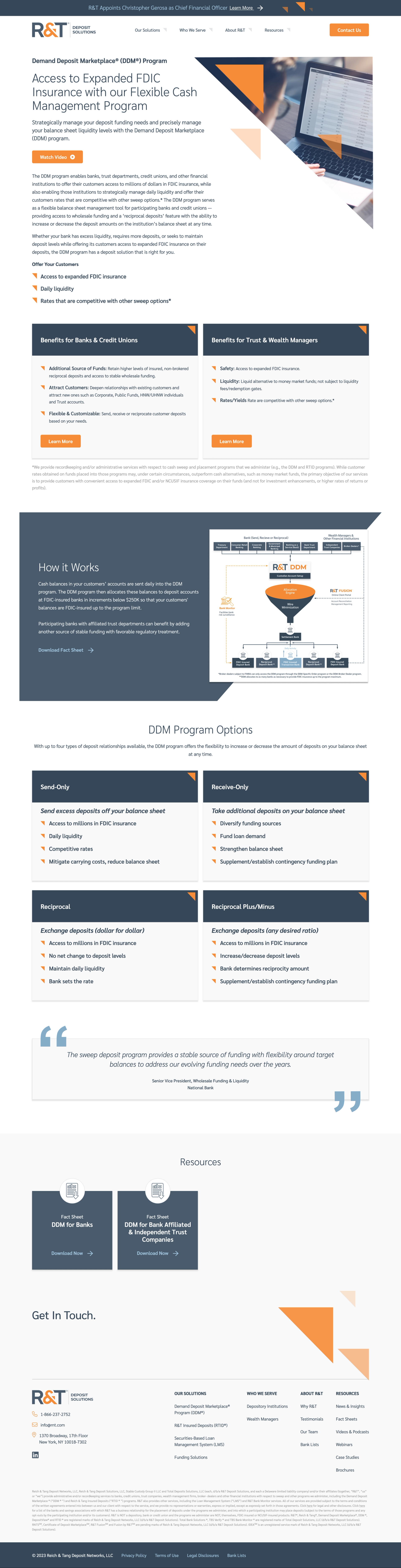 I developed this website while employed at Ridge Marketing. R&T Deposit Solutions offers an expanded suite of innovative products and services to help banks and financial institutions meet their unique cash sweep, deposit funding, and securities-based lending needs. The website is custom WordPress theme.